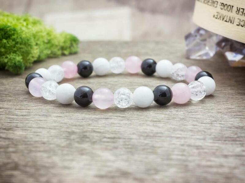 Jáde, ónix, rózsakvarc és roppantott hegyikristály ásványokból fűzött gumis karkötő. Amit a jádéról érdemes tudnod: A Jáde egy gyűjtőcsoportja a kövek egy fajtájának. Lelki gyógyhatása: Több örömmel és életkedvvel ajándékoz meg minket. Növeli a bennünk lévő szeretetet, a harmónia iránti igényünket. Testi gyógyhatás: Szabályozza a szervezet sav-bázis egyen