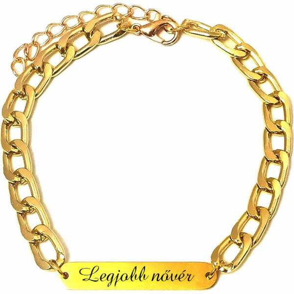 Paraméterek: – A vékonyabb karlánc: A szemek 4x3 mm-esek, vékony, elegáns, diszkrét (de azért nem a legvékonyabb karlánc). A karlánc anyaga rozsdamentes acél! A felirat lapocska kb. 30x6 mm-es, rozsdamentes tüköracél. – Vastagabb karlánc: A szemek kb. 9x7 mm-esek, nem nagyon vastag, nem is vékony. A karlánc anyaga rozsdamentes alumínium. A felirat lapocska kb. 30x6 mm-es, roz