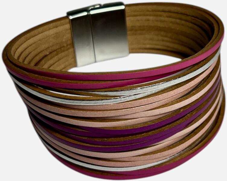 Gradines műbőr női karkötő több színben Ez a nőies, bohém hangulatú többrétegű karkötő különböző színek és textúrák játékos keverékével emeli ki viselője stílusát. Az egymásra rétegzett színes szálak elegánsan simulnak össze, létrehozva egy dinamikus, mégis harmonikus megjelenést, amely tökéletesen kiegészíti mind a hétköznapi, mind az alkalmi viseletet