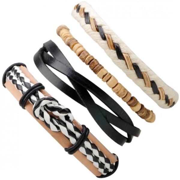 Organic Férfi karkötők Ez a karkötőszett a modern dizájnt és a színes akcentusokat kombinálja kék, fekete és fehér árnyalatokban. Minden karkötő egyedi mintával rendelkezik – a fonott dizájntól az egyszerű szövésig, ami dinamikus megjelenést kölcsönöz. A játékos színkombinációknak köszönhetően ezek a karkötők friss és laza hangulatot adnak a megjelenéséhez.