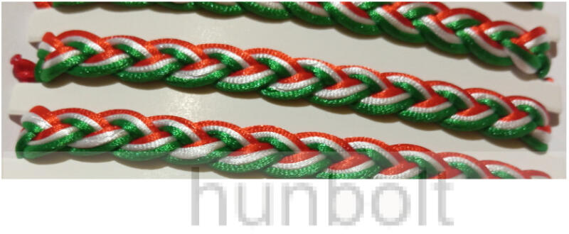 Nemzeti színű zsinórból fonott karkötő, biztonsági kötéssel. A mérete állítható.