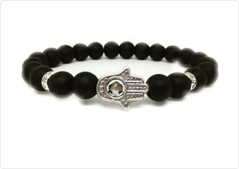 Ez egy gyönyörű egyedi tervezésű 8mm átmérőjű ónix ásványgyöngyökből készült karkötő, melyet egy hamzsakéz medál díszít.