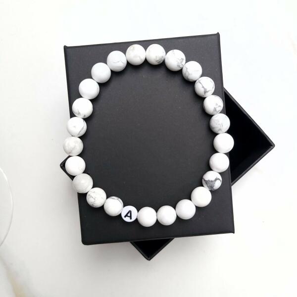 Ez az egyedi karkötő, 8 mm-es márványos howlit ásványokból készült, és egyedileg rendelhető hozzá a betű. Unisex, ajánljuk hölgyeknek és uraknak is egyaránt.