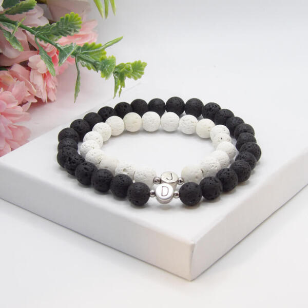 Egyedi, gondosan, szeretettel, kézzel készített páros karkötő fehér és fekete lávakő ásványból, (ásvány karkötő) egy-egy db fém betűvel, monogrammal. Ajánljuk ezt a fehér és fekete színű lávakő ásványból készült unisex karkötőt mindenkinek, hiszen egyaránt mutatós férfiakon és nőkön is ez az egyszerű, mégis elegáns ásvány karkötő. A lávakő ásványb