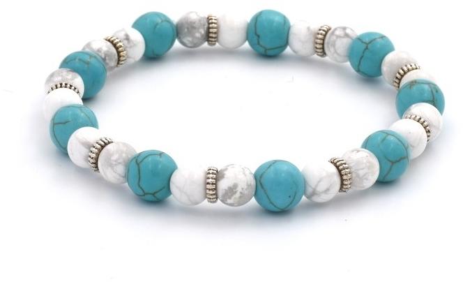Kézi készítésű, rugalmas karkötő, türkiz, howlit kristályokkal. türkiz, howlitÁllítható, rugalmas méretmérete: 6 - 8 mmMéret: 17-24 cm-es csuklóra Súly: 14 gramm