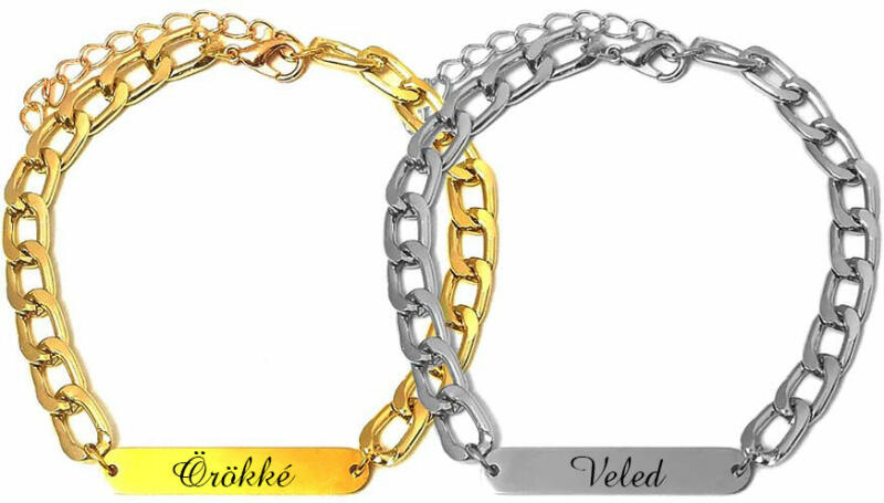 Paraméterek: – A vékonyabb karlánc: A szemek 4x3 mm-esek, vékony, elegáns, diszkrét (de azért nem a legvékonyabb karlánc). A karlánc anyaga rozsdamentes acél! A felirat lapocska kb. 30x6 mm-es, rozsdamentes tüköracél. – Vastagabb karlánc: A szemek kb. 9x7 mm-esek, nem nagyon vastag, nem is vékony. A karlánc anyaga rozsdamentes alumínium. A felirat lapocska kb. 30x6 mm-es, roz