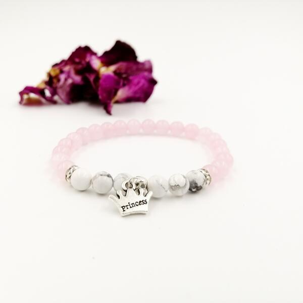 Egyedi tervezésű rózsakvarc- howlit ásványokból készült karkötő, princess medállal díszítve.