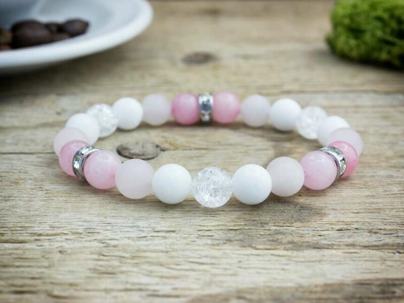 A fényes és matt felületű rózsakvarc, tejkvarc és roppantott hegykristály 8 mm-es ásvány gyöngyök gumira vannak felfűzve. A karkötőt acél köztes elemek is díszítik. Amit a rózsakvarc ról érdemes tudnod: A festetlen rózsakvarc az egész világos, szinte áttetszőtől, a ködös középrózsaszínig terjed. Az egyik legnépszerűbb kövek egyike, amely szépséges küllemének