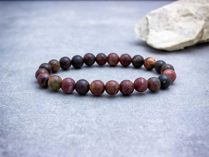 Jáspis ásvány karkötő. Az ásvány golyók gumira vannak felfűzve. Amit a jáspisról érdemes tudnod: Gyakori előfordulása és a földszínek széles skálája miatt a jáspist ősidők óta használják dísztárgyak és pecsétek készítésére. Mágikus ereje miatt is nagyra értékelték. Úgy hitték, hogy túlvilági szellemi cselszövések ellen véd és a szerelmi bánatot mérs