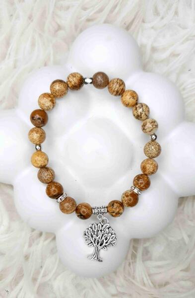 A karkötő ezüst életfa medállal, és képjáspis ásványokból készült ezüst díszítéssel.