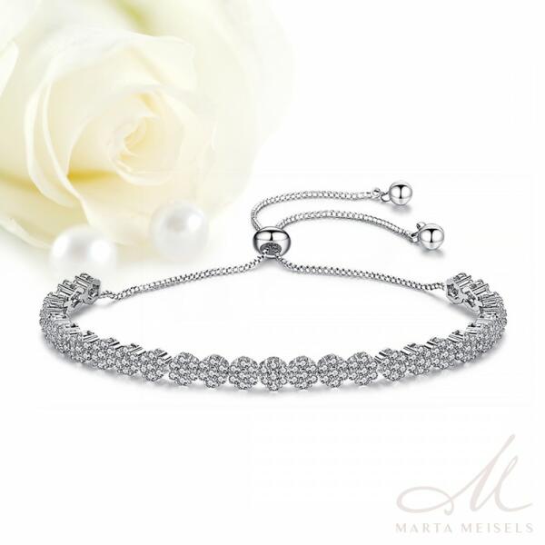 Romantikus stílusú, finom kidolgozású csillogó menyasszonyi karkötő cirkónia kristályokkal és valódi fehérarany bevonattal. Állítható, így tökéletesen illeszkedik minden csukló méretéhez. Romantikus és csillogó alkalmi karkötő, hófehér menyasszonyi ruhához ajánljuk elsősorban. Romantikus, finom sítlusú ... Garantált minőségű karkötő ... Nikkelmentes, nem okoz