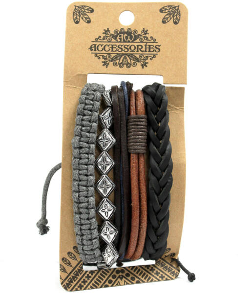 A férfias karkötő szett egy különleges és stílusos kiegészítő, amely a modern férfiak figyelmének középpontjába helyezi viselőjét. A szettben található négy karkötő kombinálja a vas és a bőr eleganciáját, egyedi és csábító készítési eljárással. Az első karkötő egy fonott fémlánc, melynek vastag, erős szemek alkotják a struktúráját. Az acél szürke sz