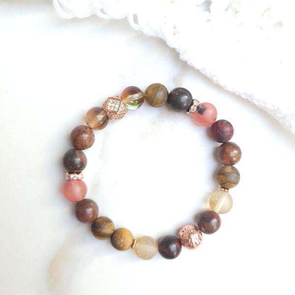 Őszi hangulatú LUXURY medálos ásványkarkötő. Egyedi tervezésű rózsaopál, tigrisszem, aura füstkvarc, jáspis és rosegold színre fújt lávakő ásványokból készült, rosegold mikrokristály medállal és díszítéssel.