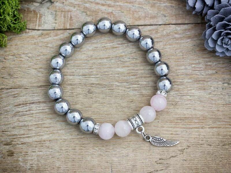8 mm-es rózsakvarc és hematit ásvány gyöngyökből fűzött gumis karkötő. Az ékszer dísze egy angyalszárny medál. Amit a rózsakvarcról tudnod érdemes: A festetlen rózsakvarc az egész világos, szinte áttetszőtől, a ködös középrózsaszínig terjed. Az egyik legnépszerűbb kövek egyike, amely szépséges küllemének és erős gyógyhatásának köszönhető. Története a