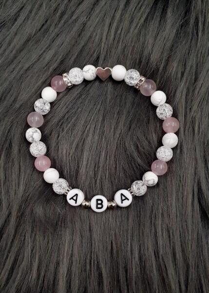 Ez az egyedi karkötő, 6 mm márványos howlit, roppantott hegyikristály és rózsakvarc ásványokból készült. A betűket egyedileg rendelhetők hozzá, melyet a vásárlás végén a megjegyzés rovatban tudsz megadni nekünk. Középen egy apró szívecske medál található.