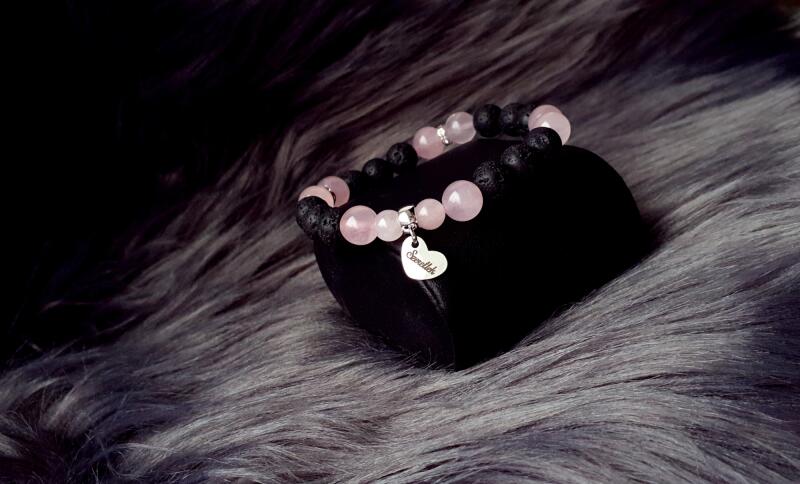 Gyönyörű csiszolt, 8mm átmérőjű rózsakvarc és lávakő ásvány gyöngyökből készült karkötő, melyet egy apró7-8 mm átmérőjű "Szeretlek" feliratos medálka díszít. Tökéletes ajándék, ha valakinek szeretnénk elmondani: Szeretlek!