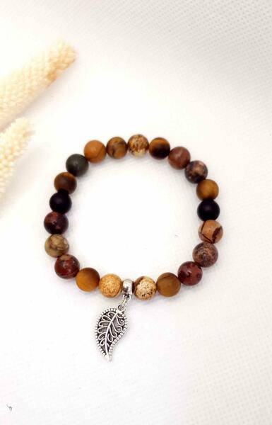 Egyedi tervezésű levél medálos ásványkarkötő, képjáspis, tigrisszem, ónix ásványokból készült.