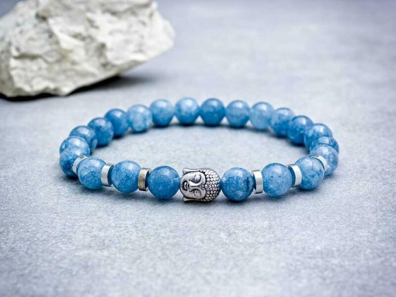 8 mm-es akvamarin ásvány gyöngyökből speciális gumira fűzött ezüst színű Buddha fejjel díszített karkötő. Amit az akvamarinról érdemes tudnod: Az akvamarin egy szinte világítóan csillogó kő, melynek a neve az olasz "tengervíz" szóból származik, megtestesítendő a tenger nagyszerűségét. A kő a berill család talán legnemesebb tagja, a zöld emerald "nővére". Színe