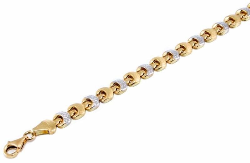 Modern stílusú, kedvelt fazonú, ródiummal és véséssel díszített, üreges, de igen mutatós stiftes, kétszínű arany karkötő.
