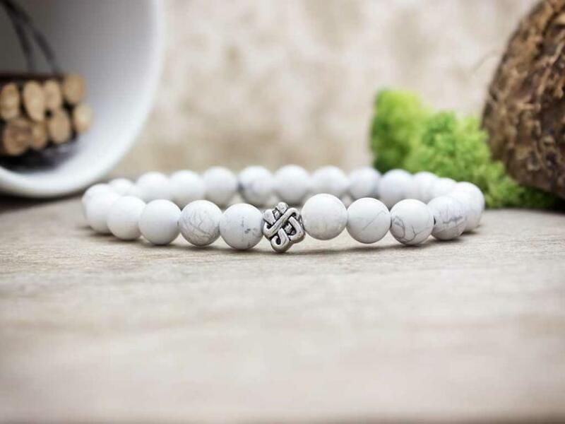 Az ásvány golyók gumira vannak felfűzve. Amit a howlitról érdemes tudnod: A howlitot Henry How-ról, egy 19-ik századi ásványkutatóról nevezték el, aki elsőkét talált rá erre a sokoldalú kőre. A howlit festetlenül matt fehér, vagy elefántcsont-színű, barnás-feketés-márványos erezettel. Lelki gyógyhatás: A howlit támogatja az ítélőképességünket, erősíti az akar