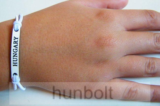 Két végén állítható méretű, gumis, fehér színű karkötő, középen fehér színű betét, Hungary felirattal. Hungary tábla: 4 x 0,5 cm