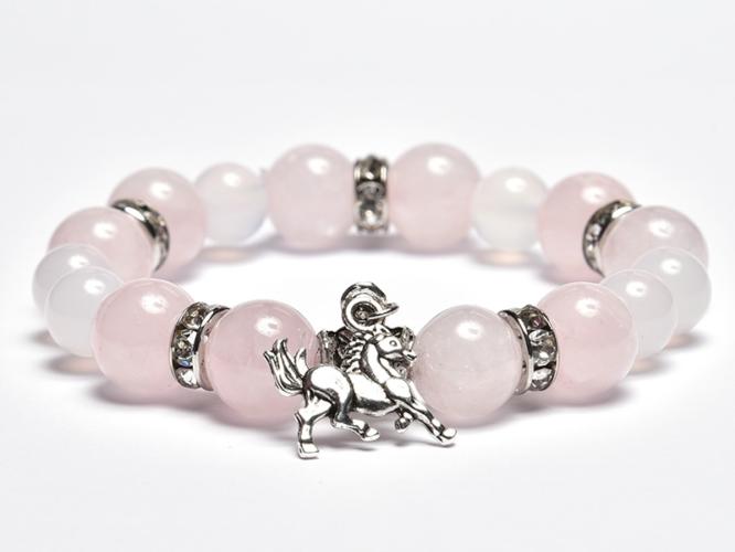 A karkötő 8 mm-es fehér achát és 10 mm-es rózsakvarcból készült, duplasorosan gyöngyfűző gumira fűzve. A díszítő elemek : 5 db 8 mm-es strasszgyűrű és 1 db szaladó lovat mintázó függő. A karkötő méretének meghatározása : a csuklód méretéhez adj hozzá 1,5 cm-t, ha Az ásványok nem helyettesítik az orvosi diagnózist és kezelést. A rózsakvarc hatása : a rózsa