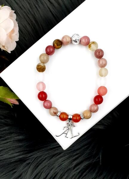 Álomszép, egyedi tervezésű 8 mm-es rodonit és rózsaopál ásványokból készült karkötő. A két betűt, amit a karkötőn szeretnél látni, kérlek a vásárlási folyamatban, a megjegyzés rovatban add meg nekünk!