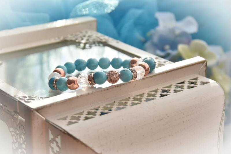 Gyönyörű Yvonne Design "rosegold" ásványkarkötő hegyikristály, howlit, rosegold lávakő ásványokból, rosegold díszítéssel.