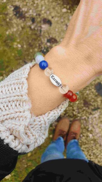 Karma feliratos gyönyörű csiszolt, 8mm átmérőjű ásványgyöngyökből készített karkötő. A karkötő ásványai: aventurin, hegyikristály, lazurit, citrin, karneol, achát, kék kvarc