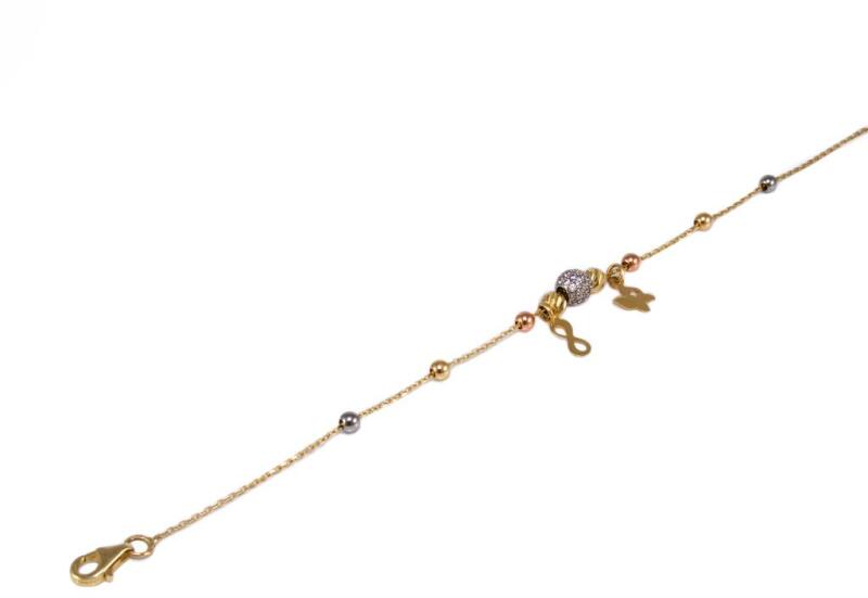 Kedvelt fazonú, középen cirkónia köves bogyóval, mellette végtelen jellel és pillangó motívummal, valamint ródiummal és rosé aranyozással ékített vésett bogyós vékony anker arany karkötő.