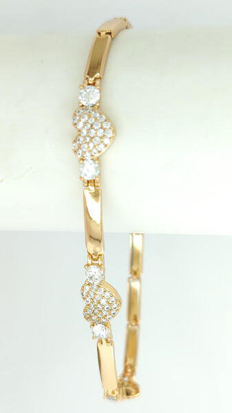 Aranyszínű karkötő, melyet szív alakú motívum díszít és fehér cirkónia kristályok tesznek csillogóvá. A kristályok karmos foglalatban helyezkednek el, a karkötő elülső harmadát díszítik. Időtálló ékszer, nem feketedik víz hatására sem. Mindennapi használatra is tökéletes választás. Antiallergén ékszer. 18K arany színben kapható. Karkötő szélessége: 7 mm