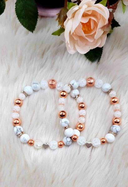 Yvonne Design Rosegold Anya-Lánya karkötőpár, Anya és Lánya részére, mely a szeretetet és az össze tartozást jelképezi az Édesanya és Lánya között. Az ékszerszett két karkötőből áll. A karkötőkön egy-egy angyalka található, és rosegold szín díszítésűek, az alábbi ásványokból készült:*áttetsző aurakvarc hegyikristály*Howlit*Láv akő*roppantott hegyikrist