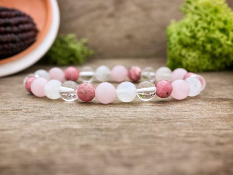 A roppantott hegyikristály, jáde és festett korall ásvány golyók gumira vannak felfűzve. Amit a jádéról érdemes tudnod: A Jáde egy gyűjtőcsoportja a kövek egy fajtájának. Lelki gyógyhatása: Több örömmel és életkedvvel ajándékoz meg minket. Növeli a bennünk lévő szeretetet, a harmónia iránti igényünket. Testi gyógyhatás: Szabályozza a szervezet sav-bázis egyens