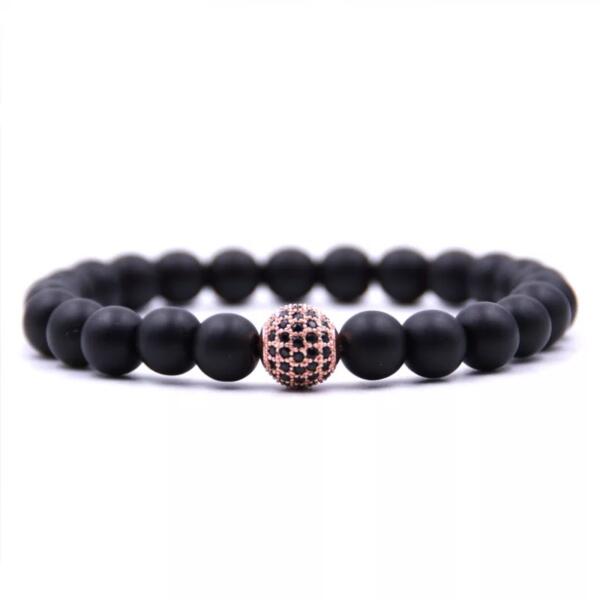 Gyönyörű egyedi LUXURY ónix ásványkarkötő rosegold szín cirkon gömb medál díszítéssel.