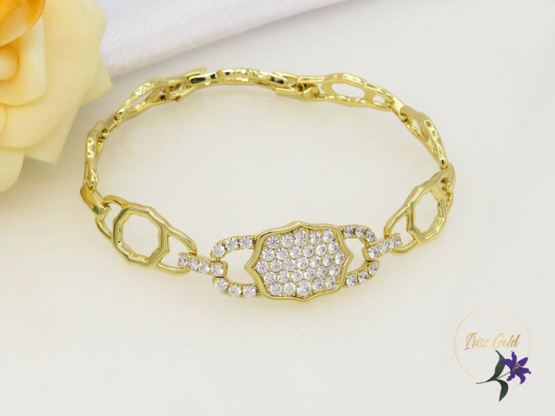 Gyönyörű antiallergén karkötő Nagy sejtalakú szemekkel középen gazdagon díszített betéttel Szin: 14K Méret: 17 cm + 3cm=20 cm Szélesség:10-15mm A forgalmazott divatékszerek alapanyaga nikkel és ólommentes ezért többnyire nem okoznak allergiás tüneteket, nyugodtan hordhatják fémérzékeny emberek is. Általában nem színezik a bőrt és más divatékszerekhez képest nagys