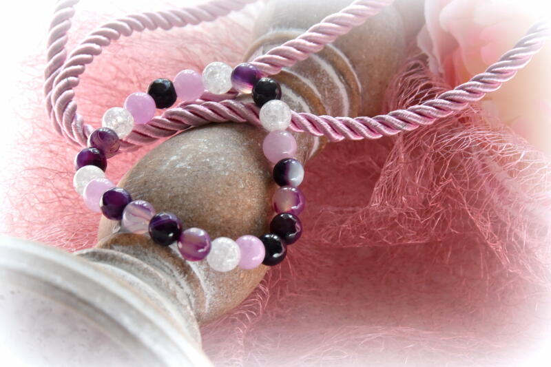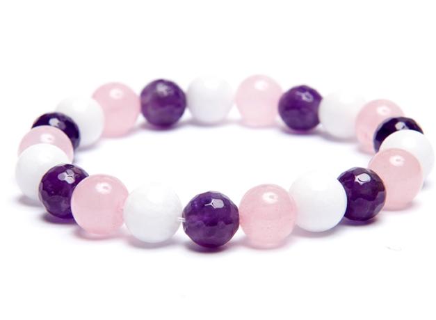 Rózsakvarc, fazettált ametiszt és tejkvarc 8 mm-es ásvány gömbjeiből fűztük ezt az ásvány karkötőt, gyöngyfűző gumira. A karkötő méretének meghatározása : a csuklód méretéhez adj hozzá kb. 1,5 cm-t. Az ásványok nem helyettesítik az orvosi diagnózist és kezelést. A rózsakvarc hatása : a rózsakvarc az egyik legkedveltebb ásvány. Megtanít a szeretet adni és elfo