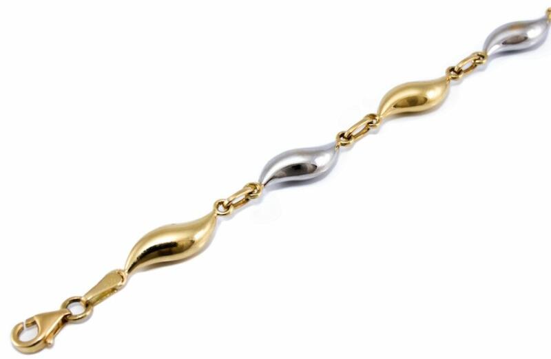 Modern stílusú, ródiummal díszített, hullám szerű szemekből készült, pufók kialakítású, masszív kétszínű arany karkötő.