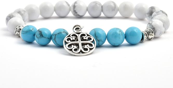 A karkötő 8 mm-es howlit és türkinit golyókból készült, duplasorosan gumira fűzve. A díszítőelem : 2 db 7x5 mm-es ezüst színű köztes és 1 db 15x18 mm-es medál. A karkötő méretének meghatározása : a csuklód méretéhez adj hozzá 1,5 cm-t. KÉRLEK VÁLASSZ MÉRETET ! Az ásványok nem helyettesítik az orvosi diagnózist és kezelést. A howlit hatása : a howlit nyugtató