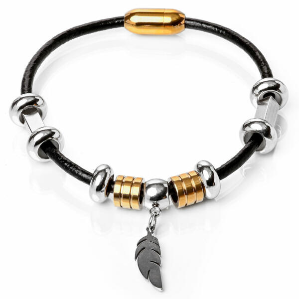Mágnes záras bőr karkötő nemesacél madártoll medállal. Paraméterek: Medál / mérete kb. 2,5 cm, anyaga nemesacél. Karkötő bőr, méretét válaszd ki a listából vagy írd be megjegyzésbe. A Maria King Bőr és nemesacél karkötő egy igazán elegáns és stílusos kiegészítő. A bőr lánc erős bőrből készült, ami nagyon kellemes érintést biztosít a viselése során. A n