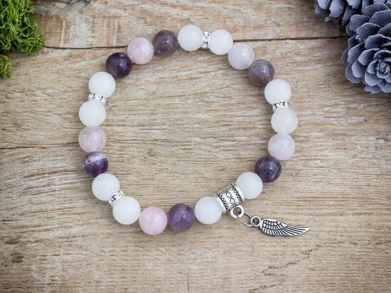8 mm-es jáde, ametiszt és rózsakvarc ásvány gyöngyökből fűzött gumis karkötő. Az ékszert angyalszárny medál díszíti. Amit az ametisztről tudnod érdemes: Az ametiszt a kvarccsoport legkedveltebb köve, az achát ásvány belső felszínén növekszik. Míg a kristály maga jó néhány centiméterre nő meg, az azt tartalmazó geóda akár több méter hosszú is lehet. Ennek a f