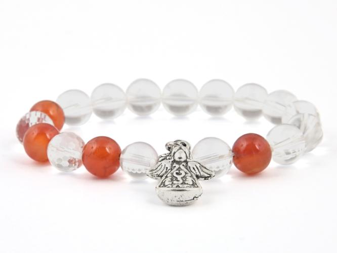 A karneol, a hegyikristály és a fazettált hegyikristály 10 mm-es gömbjeiből fűzött gumis, ásvány karkötő. A fém alkatrészeket antiallergén bevonattal látták el. Az angyal magassága : 20 mm. A karkötő méretének meghatározása a csuklód méretéhez adj hozzá 2 cm-t. Az ásványok nem helyettesítik az orvosi diagnózist és kezelést . A karneol gyógyhatása : a karneol a s
