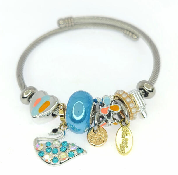 Ezüstszínű nemesacél ( 316L ) pandora jellegű karperec, melyet hattyú, szív, virág charmok, lila, égszinkék és fehér kristályok, gyöngyök díszítenek. A kristályok ragasztott foglalatban helyezkednek el. A charmok antiallergén ötvözetből készültek, ródium bevonattal. Mutatós, különleges darab. Tartó, időtálló ékszer, nem feketedik, nem színezi a bőrt. Folyamatos h