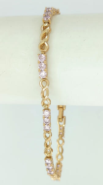 Aranyszínű karkötő, melyet rószaszín cirkónia kristályok tesznek csillogóvá. A kristályok karmos foglalatban helyezkednek el, a karkötő teljes hosszát díszítik. Időtálló ékszer, nem feketedik víz hatására sem. Mindennapi használatra is tökéletes választás. Antiallergén ékszer. 18K arany színben kapható. Karkötő szélessége: 4 mm. Az antiallergén ékszerek olyan