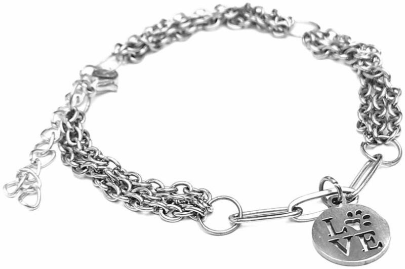 Három soros divat karkötő nemesacél tappancs love charmmal, ezüst színű. Paraméterek: Charm mérete 1,2 cm. Anyaga nemesacél, karkötő anyaga rozsdamentes acél. Karkötő mérete 17+5 cm. (Ha ettől eltérő méretet szeretnél, rendeléskor a MEGJEGYZÉSBE írd be. )