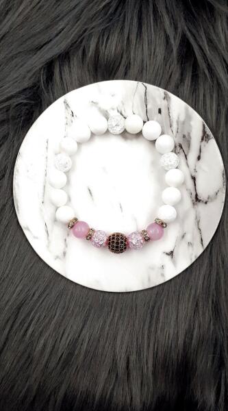 Gyönyörű egyedi LUXURY ásványkarkötő tejkvarc, roppantott hegyikristály és rózsakvarc ásványokból, rózsa arany díszítéssel és cirkon gömb medállal.