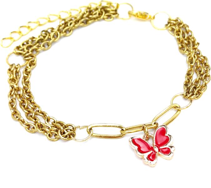 Három soros divat karkötő piros pillangós charmmal, arany színű. Paraméterek: Charm mérete 1 cm. Anyaga fémötvözet, karkötő anyaga rozsdamentes acél. Karkötő mérete 17+5 cm. (Ha ettől eltérő méretet szeretnél, rendeléskor a MEGJEGYZÉSBE írd be. )