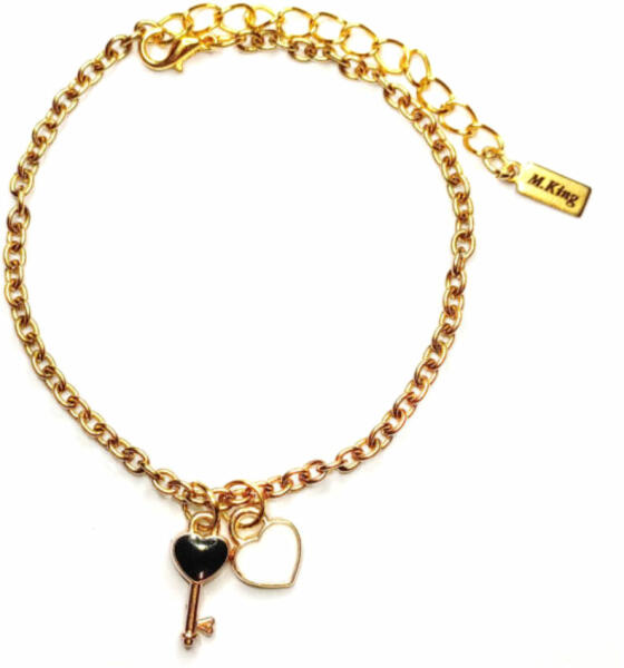 Arany színű karkötő fekete tűzzománc kulcs és fehér szív charmmal. Paraméterek:. Charmok mérete kb. 1,5 és 1 cm. Charmok anyaga fémötvözet. Karkötő mérete 17+5 cm. (Ha ettől eltérő méretet szeretnél, rendeléskor a MEGJEGYZÉSBE írd be. ) Karkötő anyaga rozsdamentes acél.