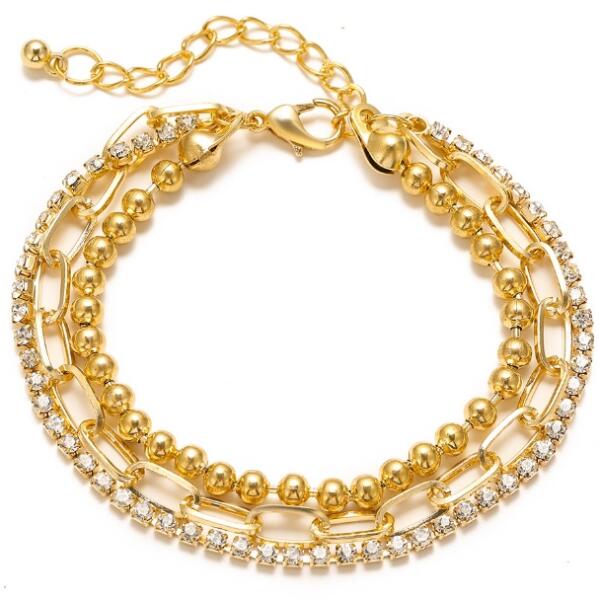 Senia Karkötő Modern Senia karkötő verhetetlen áron. A karkötő többsoros, az egyik láncot cirkónia ékkövek díszítik. Az ékszer nem tartalmaz nikkelt, ezért éezékeny bőrű emberek is viselhetik. Tulajdonságok: A karkötő hossza: 16cm + 4cm Szín: Arany Anyaga: Fém ötvözet