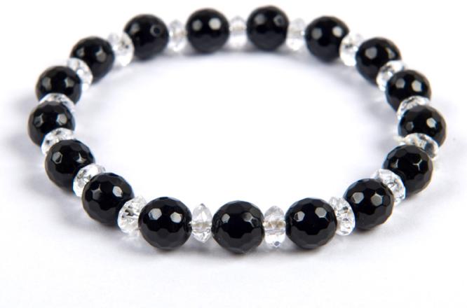A karkötő 8 mm-es fazettált ónix és 3x5 mm-es fazettált hegyikristály tárcsa felhasználásával készült, duplasoros gumira fűzve. A karkötő méretének meghatározása : a csuklód pontos méretéhez adj hozzá kb. 1,5 cm-t. KÉRLEK VÁLASSZ MÉRETET ! Az ásványok nem helyettesítik az orvosi diagnózist és kezelést. Az ónix hatása : az ónix magabiztosságot ad. Fokozza az él