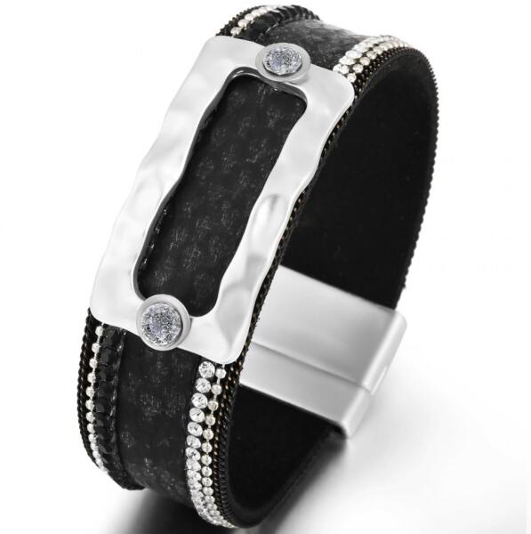 Belt Karkötő Csodaszép Belt karkötő verhetetlen áron. A karkötő mágneses kapoccsal zárható. Az ékszer nem tartalmaz nikkelt, ezért érzékeny bőrű emberek is viselhetik. Tulajdonságok: A karkötő hossza: 19cm A karkötő szélessége: 2,4cm Anyaga: Műbőr, cirkónia ékkövek, fém ötvözet Szín: Fekete